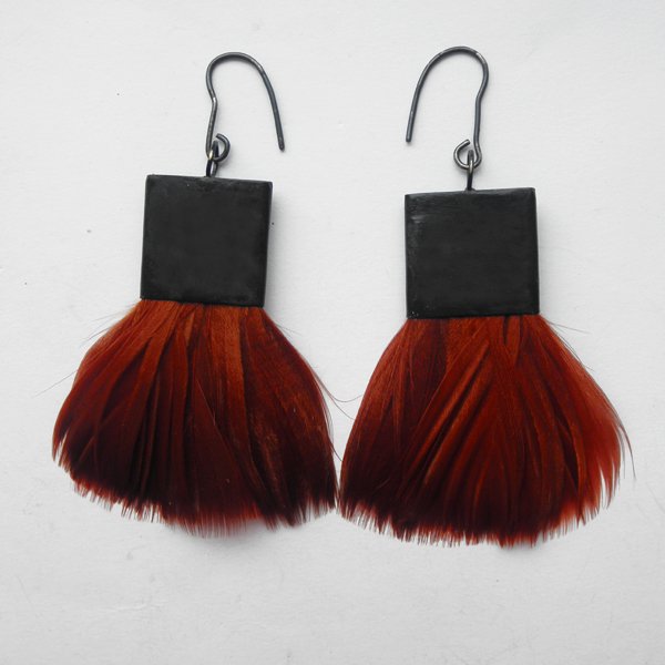 PIÓRKO - stylowy dodatek. Połączenie lekkości piórka i trwałości metalu. Metal niezwykle kontrastuje z naturalnym barwionym puchem. Kolczyki wykonane są z mosiądzu, naturalnie barwione pióra. Mosiądz - zmatowiony, oksydowany. Bigle otwarte - srebro pr.925,oksydowane. Długość z biglami - ok. 10,5 cm. Szerokość - 5,5 cm.