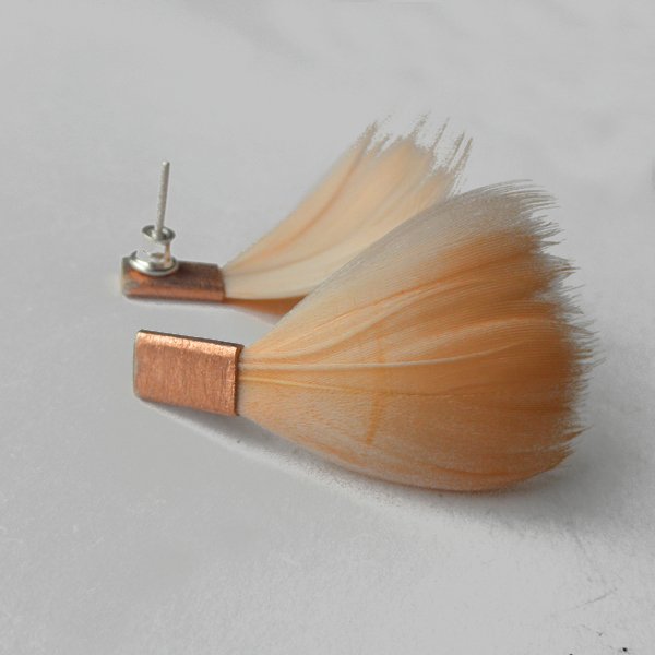 PIÓRKO - stylowy dodatek. Połączenie lekkości piórka i trwałości metalu. Metal niezwykle kontrastuje z naturalnym barwionym puchem.Kolczyki na sztyftach. Kolczyki wykonane są z :miedź,srebro- próby 0,925, naturalnie barwione pióra. Miedź - zmatowiona. Długość - ok. 3,5cm. Szerokość - 2 cm. Waga - ok. 2 g.