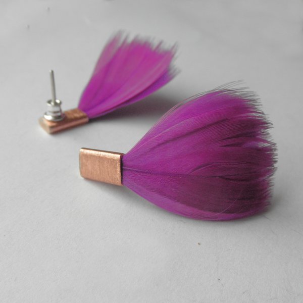 PIÓRKO - stylowy dodatek. Połączenie lekkości piórka i trwałości metalu. Metal niezwykle kontrastuje z naturalnym barwionym puchem.Kolczyki na sztyftach. Kolczyki wykonane są z :miedź,srebro- próby 0,925, naturalnie barwione pióra. Miedź - zmatowiona. Długość - ok. 3,5cm. Szerokość - 2 cm. Waga - ok. 2 g.