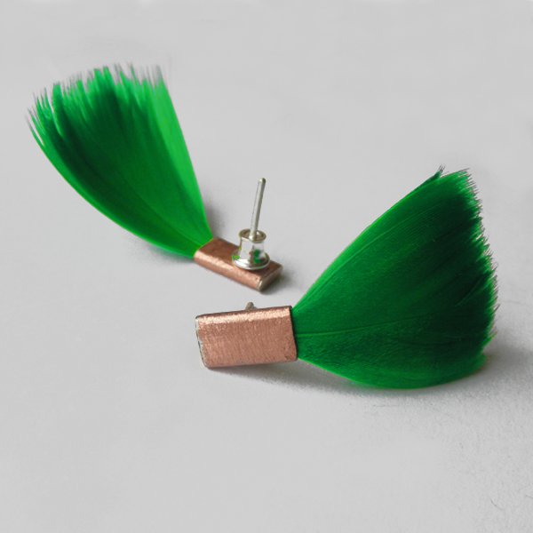 PIÓRKO - stylowy dodatek. Połączenie lekkości piórka i trwałości metalu. Metal niezwykle kontrastuje z naturalnym barwionym puchem.Kolczyki na sztyftach. Kolczyki wykonane są z :miedź,srebro- próby 0,925, naturalnie barwione pióra. Miedź - zmatowiona. Długość - ok. 3,5cm. Szerokość - 2 cm. Waga - ok. 2 g.