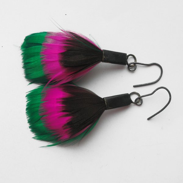 PIÓRKO - stylowy dodatek. Połączenie lekkości piórka i trwałości metalu. Metal niezwykle kontrastuje z naturalnym barwionym puchem. Kolczyki wykonane są z mosiądzu, naturalnie barwione pióra. Mosiądz - oksydowany. Bigle otwarte - srebro pr.925,oksydowane. Długość z biglami - 7,5 cm. Szerokość - ok. 3 cm.