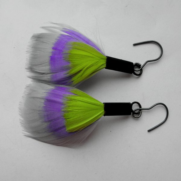 PIÓRKO - stylowy dodatek. Połączenie lekkości piórka i trwałości metalu. Metal niezwykle kontrastuje z naturalnym barwionym puchem. Kolczyki wykonane są z mosiądzu, naturalnie barwione pióra. Mosiądz - oksydowany. Bigle otwarte - srebro pr.925,oksydowane. Długość z biglami - 7,5 cm. Szerokość - ok. 3 cm.