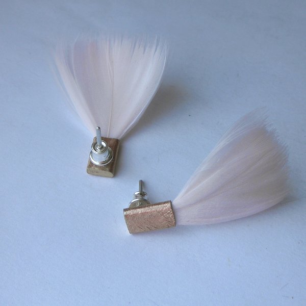 PIÓRKO - stylowy dodatek. Połączenie lekkości piórka i trwałości metalu. Metal niezwykle kontrastuje z naturalnym barwionym puchem.Kolczyki na sztyftach. Kolczyki wykonane są z :miedź,srebro- próby 0,925, naturalnie barwione pióra. Miedź - zmatowiona. Długość - ok. 3,5cm. Szerokość - 2 cm. Waga - ok. 2 g.