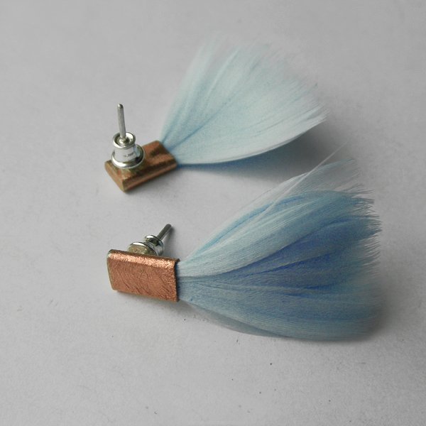 PIÓRKO - stylowy dodatek. Połączenie lekkości piórka i trwałości metalu. Metal niezwykle kontrastuje z naturalnym barwionym puchem.Kolczyki na sztyftach. Kolczyki wykonane są z :miedź,srebro- próby 0,925, naturalnie barwione pióra. Miedź - zmatowiona. Długość - ok. 3,5cm. Szerokość - 2 cm. Waga - ok. 2 g.
