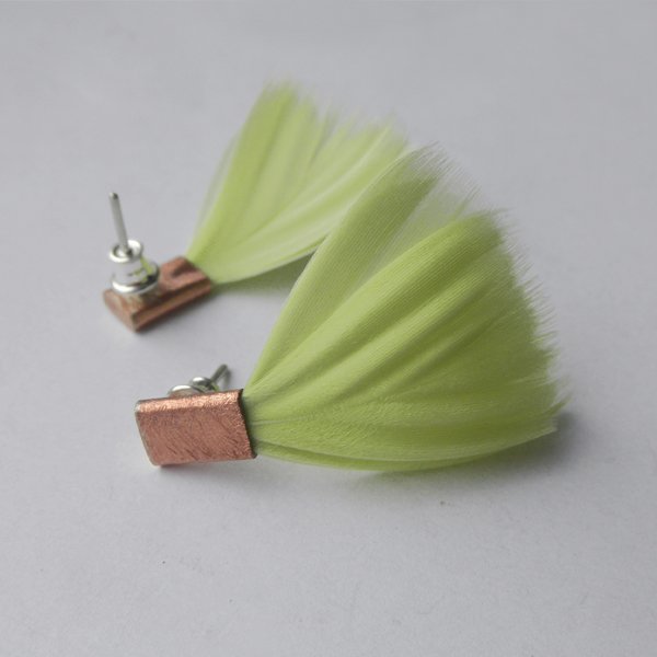 PIÓRKO - stylowy dodatek. Połączenie lekkości piórka i trwałości metalu. Metal niezwykle kontrastuje z naturalnym barwionym puchem.Kolczyki na sztyftach. Kolczyki wykonane są z :miedź,srebro- próby 0,925, naturalnie barwione pióra. Miedź - zmatowiona. Długość - ok. 3,5cm. Szerokość - 2 cm. Waga - ok. 2 g.