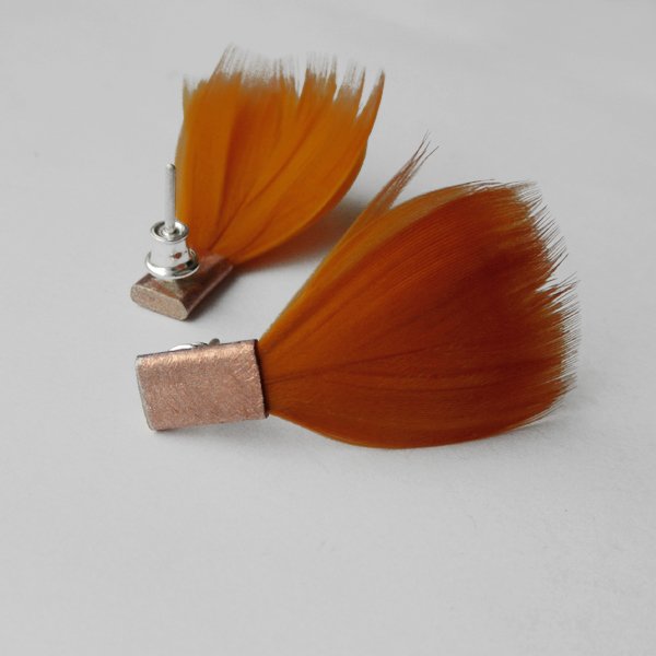 PIÓRKO - stylowy dodatek. Połączenie lekkości piórka i trwałości metalu. Metal niezwykle kontrastuje z naturalnym barwionym puchem.Kolczyki na sztyftach. Kolczyki wykonane są z :miedź,srebro- próby 0,925, naturalnie barwione pióra. Miedź - zmatowiona. Długość - ok. 3,5cm. Szerokość - 2 cm. Waga - ok. 2 g.