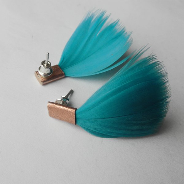 PIÓRKO - stylowy dodatek. Połączenie lekkości piórka i trwałości metalu. Metal niezwykle kontrastuje z naturalnym barwionym puchem.Kolczyki na sztyftach. Kolczyki wykonane są z :miedź,srebro- próby 0,925, naturalnie barwione pióra. Miedź - zmatowiona. Długość - ok. 3,5cm. Szerokość - 2 cm. Waga - ok. 2 g.