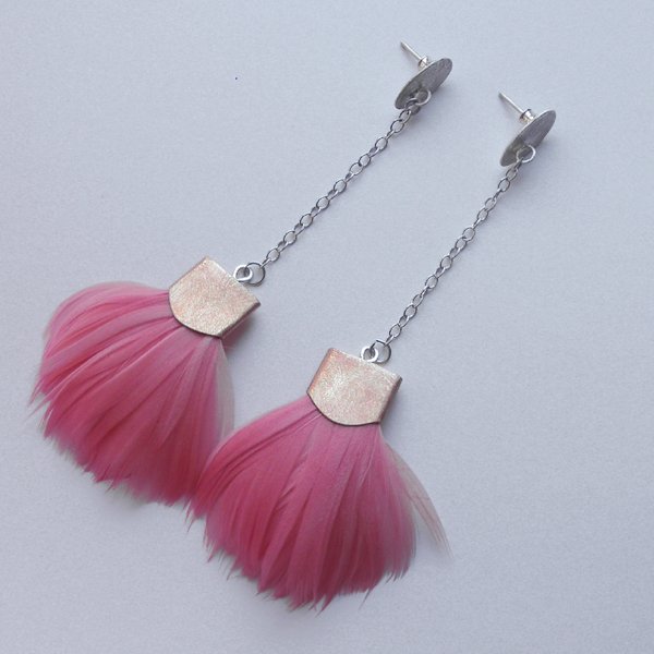 PIÓRKO - stylowy dodatek. Połączenie lekkości piórka i trwałości metalu. Metal niezwykle kontrastuje z naturalnym barwionym puchem. Kolczyki na sztyftach. Kolczyki wykonane są z : srebro, brąz, naturalnie barwione pióra. Brąz - . Długość - 10,5 cm. Szerokość - 4 cm.