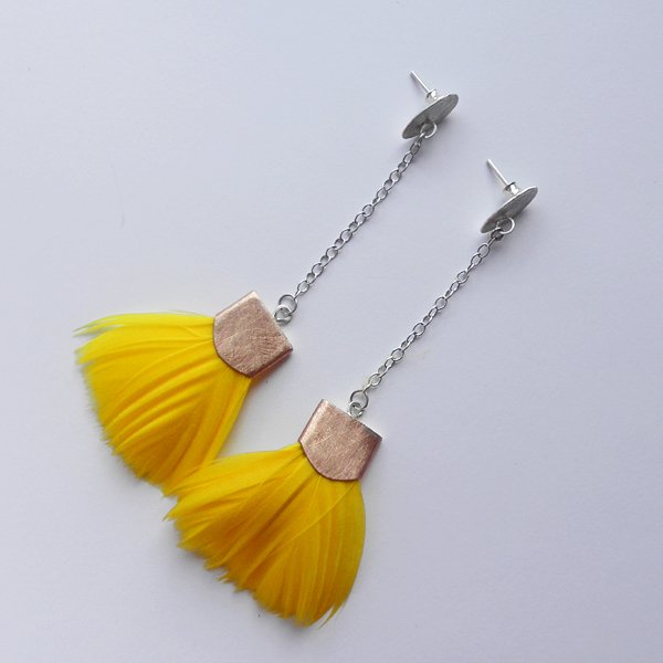 PIÓRKO - stylowy dodatek. Połączenie lekkości piórka i trwałości metalu. Metal niezwykle kontrastuje z naturalnym barwionym puchem. Kolczyki na sztyftach. Kolczyki wykonane są z : srebro, brąz, naturalnie barwione pióra. Brąz - . Długość - 10,5 cm. Szerokość - 4 cm.