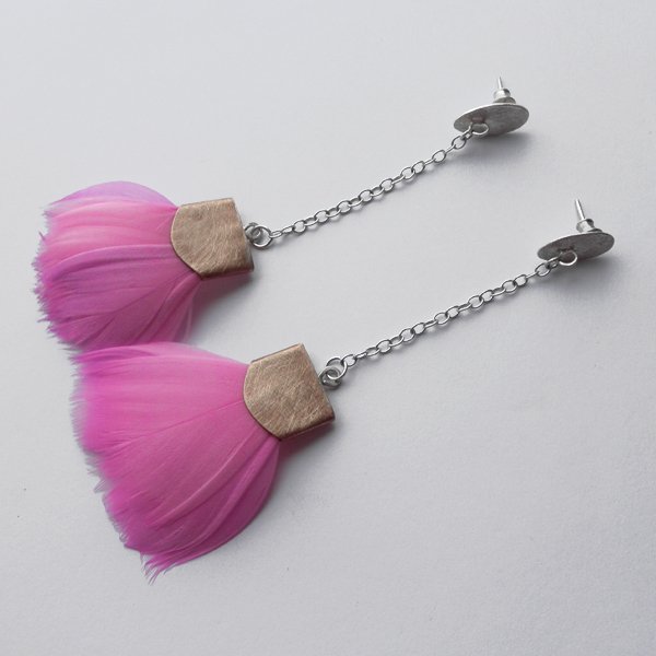 PIÓRKO - stylowy dodatek. Połączenie lekkości piórka i trwałości metalu. Metal niezwykle kontrastuje z naturalnym barwionym puchem. Kolczyki na sztyftach. Kolczyki wykonane są z : srebro, brąz, naturalnie barwione pióra. Brąz - . Długość - 10,5 cm. Szerokość - 4 cm.