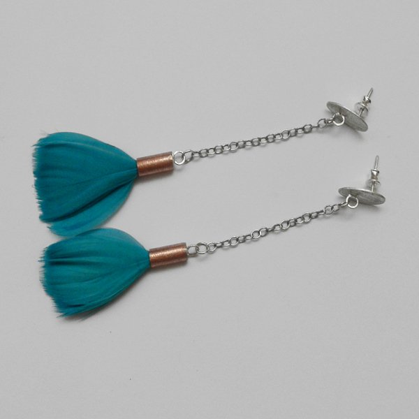 PIÓRKO - stylowy dodatek. Połączenie lekkości piórka i trwałości metalu. Metal niezwykle kontrastuje z naturalnym barwionym puchem. Kolczyki na sztyftach. Kolczyki wykonane są z : srebro,miedź, naturalnie barwione pióra. miedź -zmatowiona . Długość - 10,5 cm. Szerokość - 3 cm.