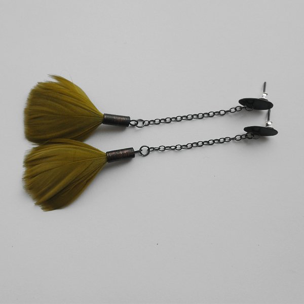 PIÓRKO - stylowy dodatek. Połączenie lekkości piórka i trwałości metalu. Metal niezwykle kontrastuje z naturalnym barwionym puchem. Kolczyki na sztyftach. Kolczyki wykonane są z : srebro,miedź, naturalnie barwione pióra. miedź -zmatowiona, oksydowana. Srebro- oksydowane.Długość - 10,5 cm. Szerokość - 3 cm.