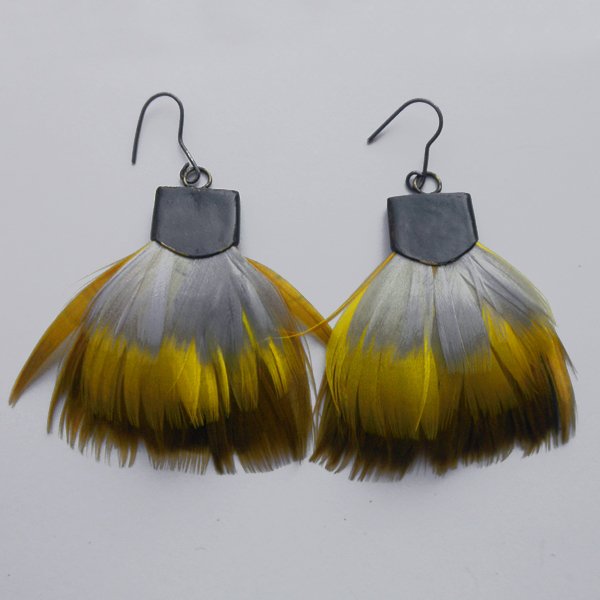 PIÓRKO - stylowy dodatek. Połączenie lekkości piórka i trwałości metalu. Metal niezwykle kontrastuje z naturalnym barwionym puchem. Kolczyki wykonane są z mosiądzu, naturalnie barwione pióra. Mosiądz - oksydowany. Bigle otwarte - srebro pr.925,oksydowane. Długość z biglami - 6,5 cm. Szerokość - 4 cm. Istnieje możliwość wykonania kolczyków w innej kolorystyce.