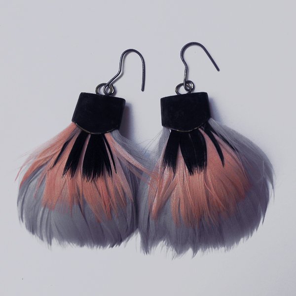 PIÓRKO - stylowy dodatek. Połączenie lekkości piórka i trwałości metalu. Metal niezwykle kontrastuje z naturalnym barwionym puchem. Kolczyki wykonane są z mosiądzu, naturalnie barwione pióra. Mosiądz - oksydowany. Bigle otwarte - srebro pr.925,oksydowane. Długość z biglami - 6,5 cm. Szerokość - 4 cm. Istnieje możliwość wykonania kolczyków w innej kolorystyce.