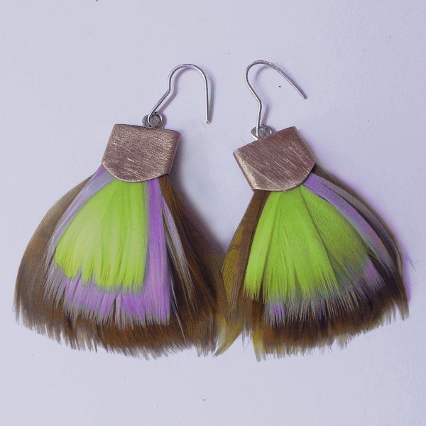PIÓRKO - stylowy dodatek. Połączenie lekkości piórka i trwałości metalu. Metal niezwykle kontrastuje z naturalnym barwionym puchem. Kolczyki wykonane są z brązu, naturalnie barwione pióra. Bigle otwarte - srebro pr.925,. Długość z biglami - 6,5 cm. Szerokość - 4 cm. Istnieje możliwość wykonania kolczyków w innej kolorystyce.