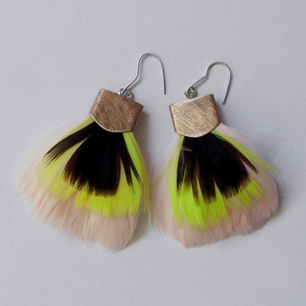 PIÓRKO - stylowy dodatek. Połączenie lekkości piórka i trwałości metalu. Metal niezwykle kontrastuje z naturalnym barwionym puchem. Kolczyki wykonane są z brązu, naturalnie barwione pióra. Bigle otwarte - srebro pr.925,. Długość z biglami - 6,5 cm. Szerokość - 4 cm. Istnieje możliwość wykonania kolczyków w innej kolorystyce.