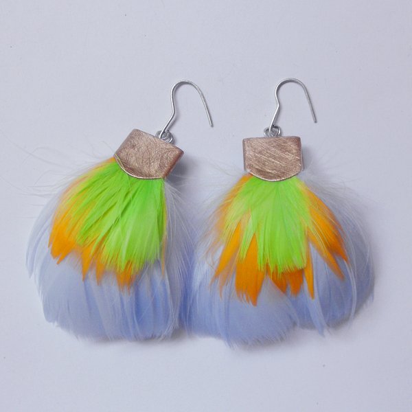 PIÓRKO - stylowy dodatek. Połączenie lekkości piórka i trwałości metalu. Metal niezwykle kontrastuje z naturalnym barwionym puchem. Kolczyki wykonane są z brązu, naturalnie barwione pióra. Bigle otwarte - srebro pr.925,. Długość z biglami - 6,5 cm. Szerokość - 4 cm. Istnieje możliwość wykonania kolczyków w innej kolorystyce.
