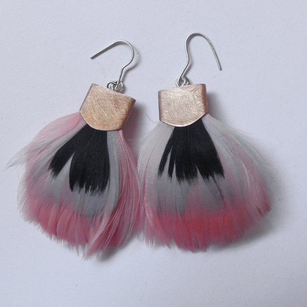 PIÓRKO - stylowy dodatek. Połączenie lekkości piórka i trwałości metalu. Metal niezwykle kontrastuje z naturalnym barwionym puchem. Kolczyki wykonane są z brązu, naturalnie barwione pióra. Bigle otwarte - srebro pr.925,. Długość z biglami - 6,5 cm. Szerokość - 4 cm. Istnieje możliwość wykonania kolczyków w innej kolorystyce.