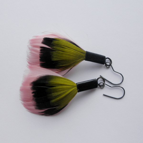 PIÓRKO - stylowy dodatek. Połączenie lekkości piórka i trwałości metalu. Metal niezwykle kontrastuje z naturalnym barwionym puchem. Kolczyki wykonane są z mosiądzu, naturalnie barwione pióra. Mosiądz - oksydowany. Bigle otwarte - srebro pr.925,oksydowane. Długość z biglami - 7,5 cm. Szerokość - ok. 3 cm.