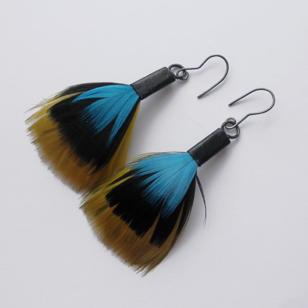 PIÓRKO - stylowy dodatek. Połączenie lekkości piórka i trwałości metalu. Metal niezwykle kontrastuje z naturalnym barwionym puchem. Kolczyki wykonane są z mosiądzu, naturalnie barwione pióra. Mosiądz - oksydowany. Bigle otwarte - srebro pr.925,oksydowane. Długość z biglami - 7,5 cm. Szerokość - ok. 3 cm.