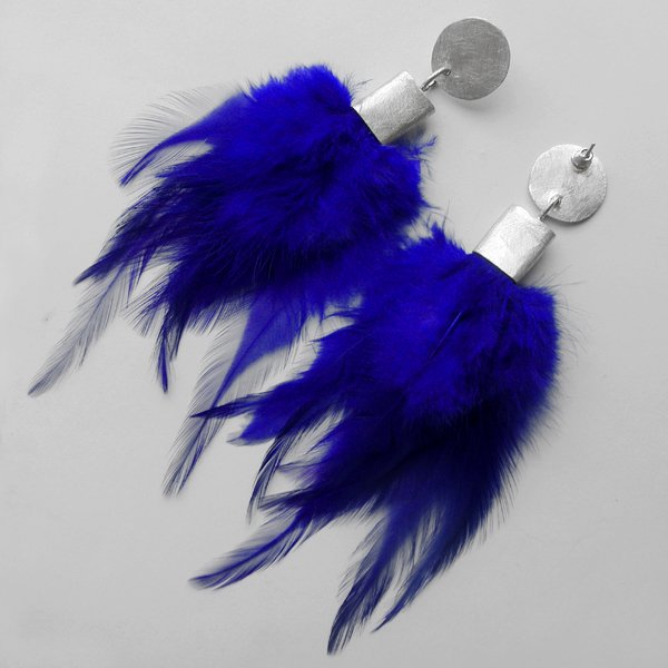 PIÓRKO - stylowy dodatek. Połączenie lekkości piórka i trwałości metalu. Metal niezwykle kontrastuje z naturalnym barwionym puchem. Kolczyki na sztyftach. Kolczyki wykonane są z : srebro, naturalnie barwione pióra. srebro -zmatowione. Długość ok. 15 cm. Szerokość - 6 cm.