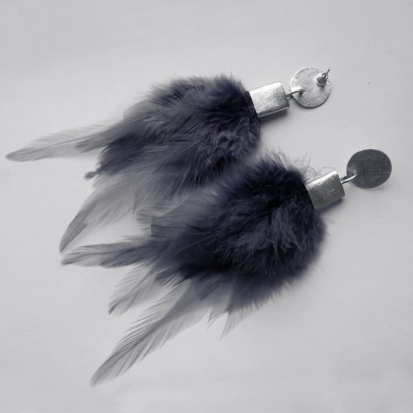 PIÓRKO - stylowy dodatek. Połączenie lekkości piórka i trwałości metalu. Metal niezwykle kontrastuje z naturalnym barwionym puchem. Kolczyki na sztyftach. Kolczyki wykonane są z : srebro, naturalnie barwione pióra. srebro -zmatowione. Długość ok. 15 cm. Szerokość - 6 cm.