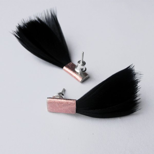 PIÓRKO - stylowy dodatek. Połączenie lekkości piórka i trwałości metalu. Metal niezwykle kontrastuje z naturalnym barwionym puchem.Kolczyki na sztyftach. Kolczyki wykonane są z :miedź,srebro- próby 0,925, naturalnie barwione pióra. Miedź - zmatowiona. Długość - ok. 3,5cm. Szerokość - 2 cm. Waga - ok. 2 g.