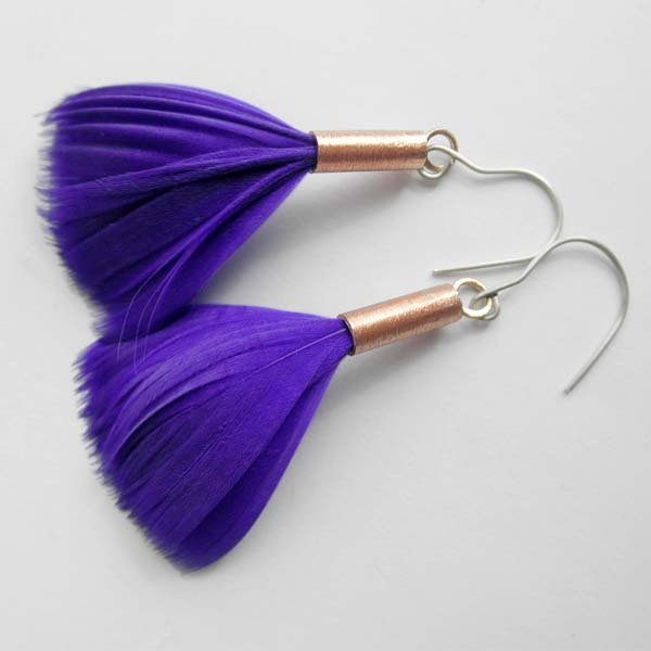 Kolczyki wykonane są z : miedź, naturalne barwione pióra.