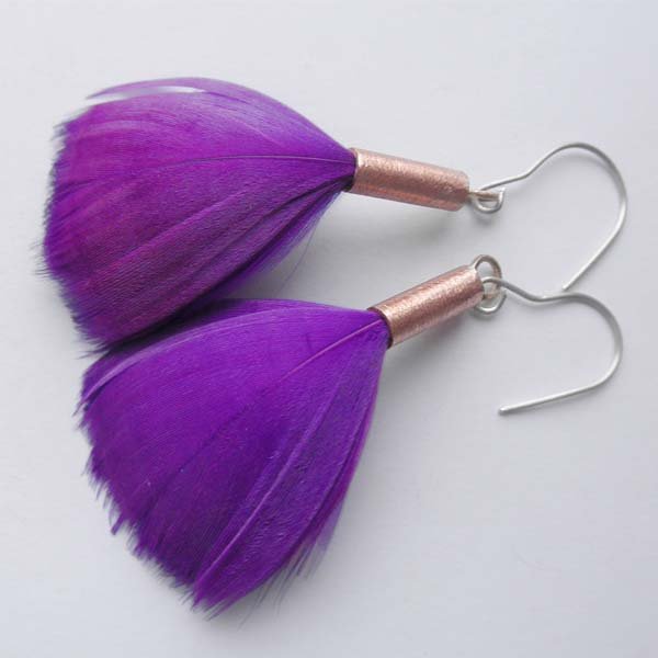 Kolczyki wykonane są z : miedź, naturalne barwione pióra.
