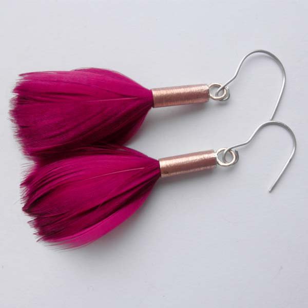 Kolczyki wykonane są z : miedź, naturalne barwione pióra.