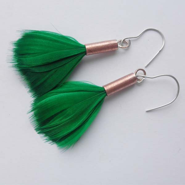 Kolczyki wykonane są z : miedź, naturalne barwione pióra.