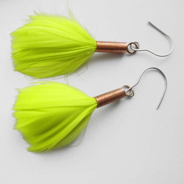 Kolczyki wykonane są z : miedź, naturalne barwione pióra.
