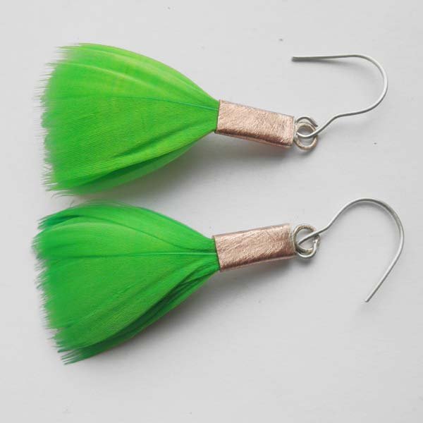 Kolczyki wykonane są z : miedź, naturalne barwione pióra.