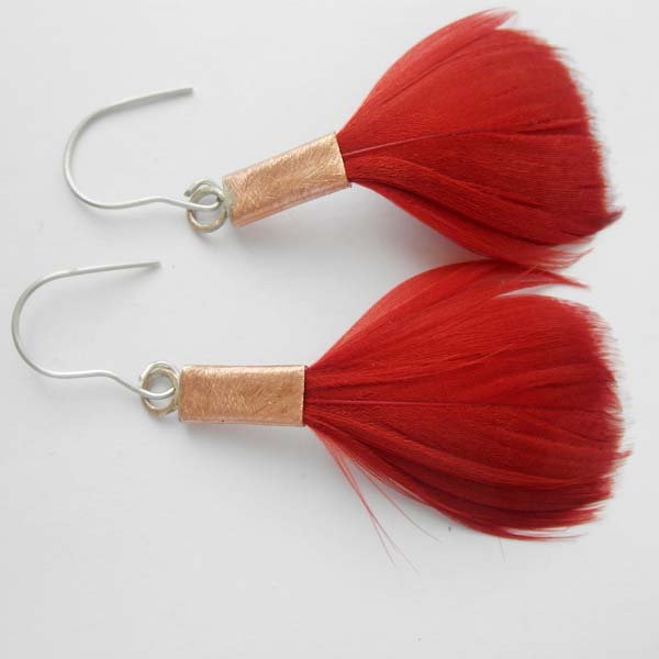 Kolczyki wykonane są z : miedź, naturalne barwione pióra.