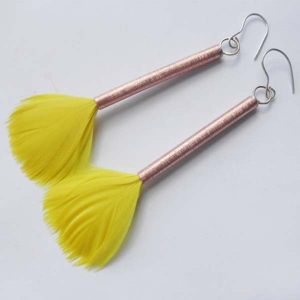 Kolczyki wykonane są z : miedź, naturalne barwione pióra.