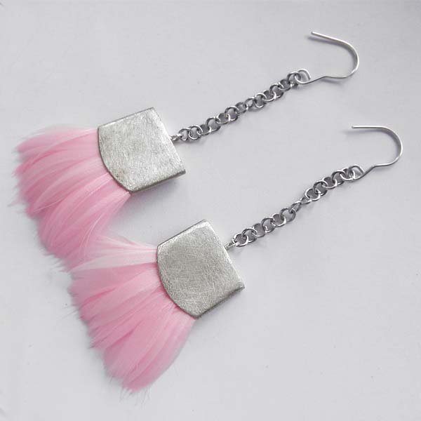 PIÓRKO - stylowy dodatek. Połączenie lekkości piórka i trwałości metalu. Metal niezwykle kontrastuje z naturalnym barwionym puchem. Kolczyki wykonane są z alpaka, naturalnie barwione pióra. Alpaka - zmatowiona. Bigle otwarte - srebro pr.925. Długość - 10 cm. Szerokość - 4 cm.