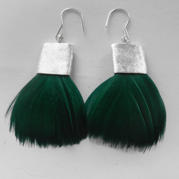 PIÓRKO - stylowy dodatek. Połączenie lekkości piórka i trwałości metalu. Metal niezwykle kontrastuje z naturalnym barwionym puchem. Kolczyki wykonane są z : srebro, naturalnie barwione pióra. Srebro -zmatowione. Długość z biglami ok. 7 cm. Szerokość - 3,5 cm