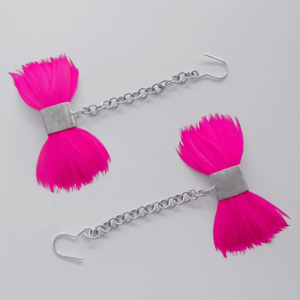 PIÓRKO - stylowy dodatek. Połączenie lekkości piórka i trwałości metalu. Metal niezwykle kontrastuje z naturalnym barwionym puchem. Kolczyki wykonane są z alpaka, naturalnie barwione pióra. Alpaka - zmatowiona. Bigle otwarte - srebro pr.925. Długość - 8,5 cm. Szerokość - 6 cm.