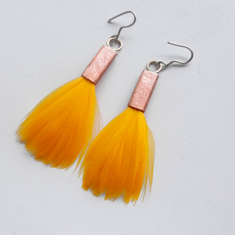 Kolczyki wykonane są z : miedź, naturalne barwione pióra.