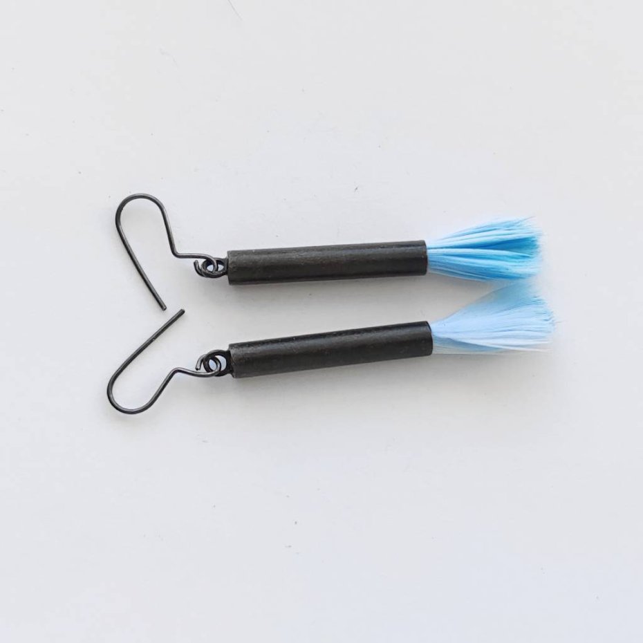PIÓRKO - stylowy dodatek. Połączenie lekkości piórka i trwałości metalu. Metal niezwykle kontrastuje z naturalnym barwionym puchem. Kolczyki wykonane są z mosiądz, naturalnie barwione pióra. Mosiądz - zmatowiony, oksydowane, przecierane. Bigle otwarte - srebro pr.925 oksydowane. Długość z biglami - 5 cm.