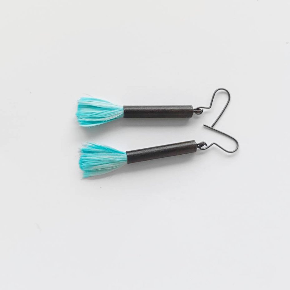 PIÓRKO - stylowy dodatek. Połączenie lekkości piórka i trwałości metalu. Metal niezwykle kontrastuje z naturalnym barwionym puchem. Kolczyki wykonane są z mosiądz, naturalnie barwione pióra. Mosiądz - zmatowiony, oksydowane, przecierane. Bigle otwarte - srebro pr.925 oksydowane. Długość z biglami - 5 cm.