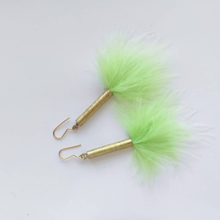 PIÓRKO - stylowy dodatek. Połączenie lekkości piórka i trwałości metalu. Metal niezwykle kontrastuje z naturalnym barwionym puchem. Kolczyki wykonane są z mosiądz, naturalnie barwione pióra. Mosiądz - zmatowiony. Bigle otwarte - srebro pr.925, pozłacane. Długość z biglami - 7,5 cm