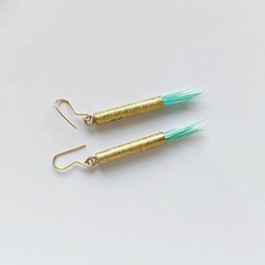 PIÓRKO - stylowy dodatek. Połączenie lekkości piórka i trwałości metalu. Metal niezwykle kontrastuje z naturalnym barwionym puchem. Kolczyki wykonane są z mosiądz, naturalnie barwione pióra. Mosiądz - zmatowiony. Bigle otwarte - srebro pr.925, pozłacane. Długość z biglami - 5 cm