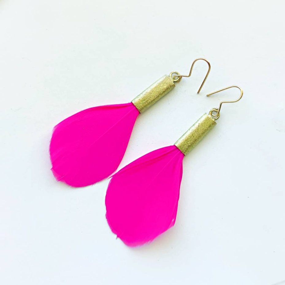PIÓRKO - stylowy dodatek. Połączenie lekkości piórka i trwałości metalu. Metal niezwykle kontrastuje z naturalnym barwionym puchem. Kolczyki wykonane są z mosiądz, naturalnie barwione pióra. Mosiądz - zmatowiony. Bigle otwarte - srebro pr.925, pozłacane. Długość z biglami - 7 cm