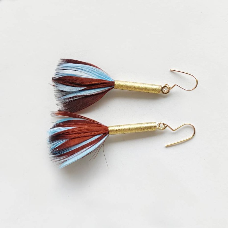 PIÓRKO - stylowy dodatek. Połączenie lekkości piórka i trwałości metalu. Metal niezwykle kontrastuje z naturalnym barwionym puchem. Kolczyki wykonane są z mosiądz, naturalnie barwione pióra. Mosiądz - zmatowiony. Bigle otwarte - srebro pr.925, pozłacane. Długość z biglami - 5,5 cm