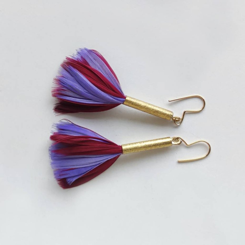 PIÓRKO - stylowy dodatek. Połączenie lekkości piórka i trwałości metalu. Metal niezwykle kontrastuje z naturalnym barwionym puchem. Kolczyki wykonane są z mosiądz, naturalnie barwione pióra. Mosiądz - zmatowiony. Bigle otwarte - srebro pr.925, pozłacane. Długość z biglami - 5,5 cm