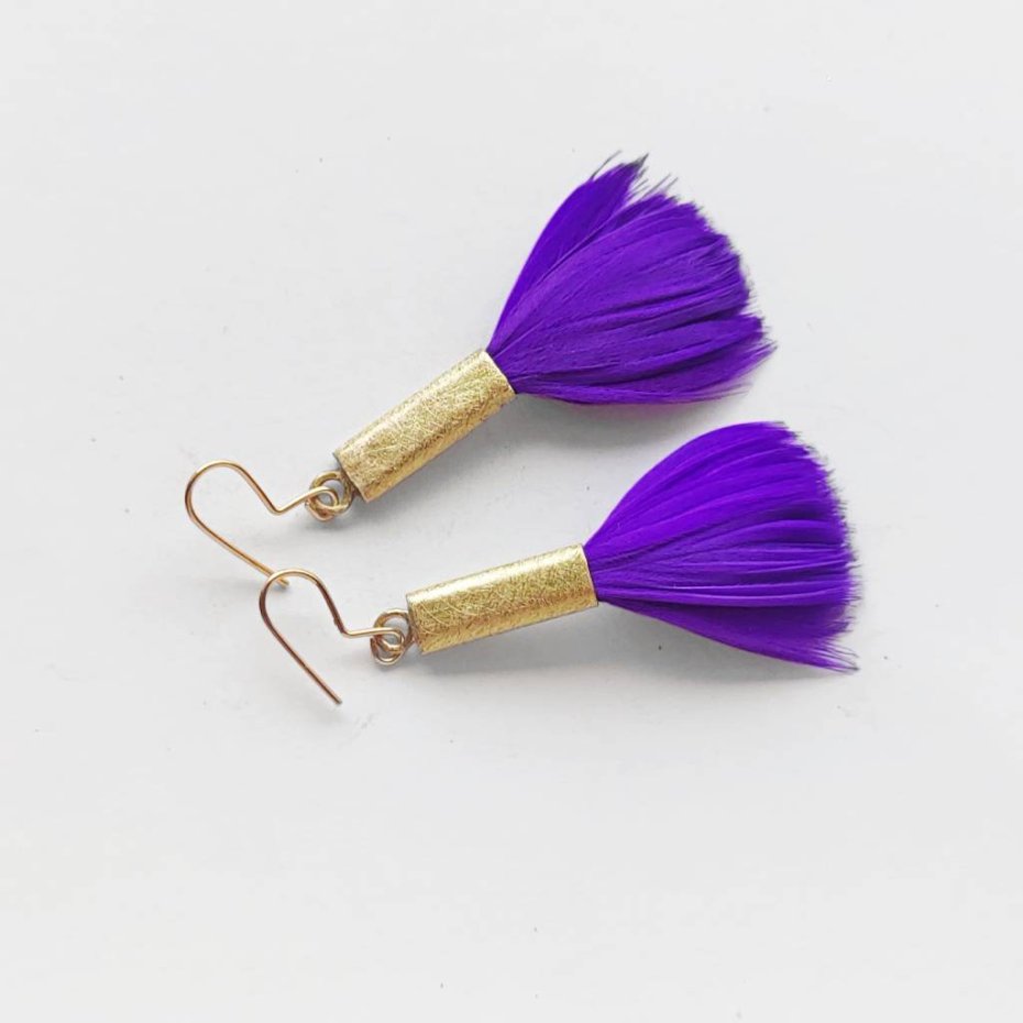 PIÓRKO - stylowy dodatek. Połączenie lekkości piórka i trwałości metalu. Metal niezwykle kontrastuje z naturalnym barwionym puchem. Kolczyki wykonane są z mosiądz, naturalnie barwione pióra. Mosiądz - zmatowiony. Bigle otwarte - srebro pr.925, pozłacane. Długość z biglami - 5,5 cm