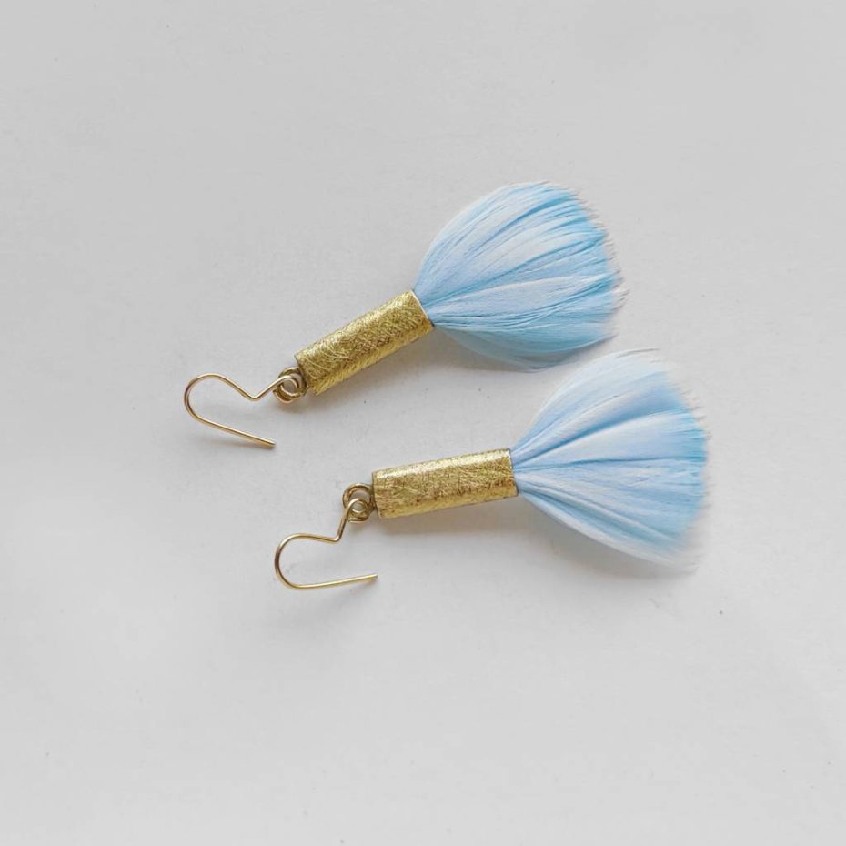 PIÓRKO - stylowy dodatek. Połączenie lekkości piórka i trwałości metalu. Metal niezwykle kontrastuje z naturalnym barwionym puchem. Kolczyki wykonane są z mosiądz, naturalnie barwione pióra. Mosiądz - zmatowiony. Bigle otwarte - srebro pr.925, pozłacane. Długość z biglami - 5,5 cm