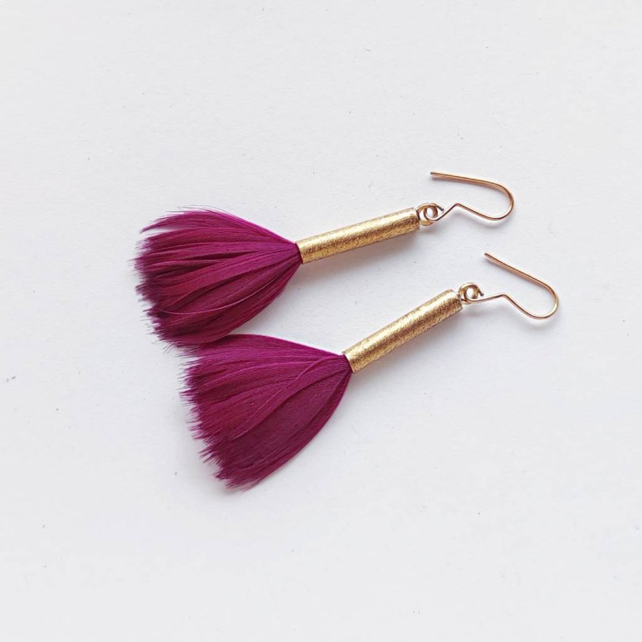 PIÓRKO - stylowy dodatek. Połączenie lekkości piórka i trwałości metalu. Metal niezwykle kontrastuje z naturalnym barwionym puchem. Kolczyki wykonane są z mosiądz, naturalnie barwione pióra. Mosiądz - zmatowiony. Bigle otwarte - srebro pr.925, pozłacane. Długość z biglami - 5,5 cm