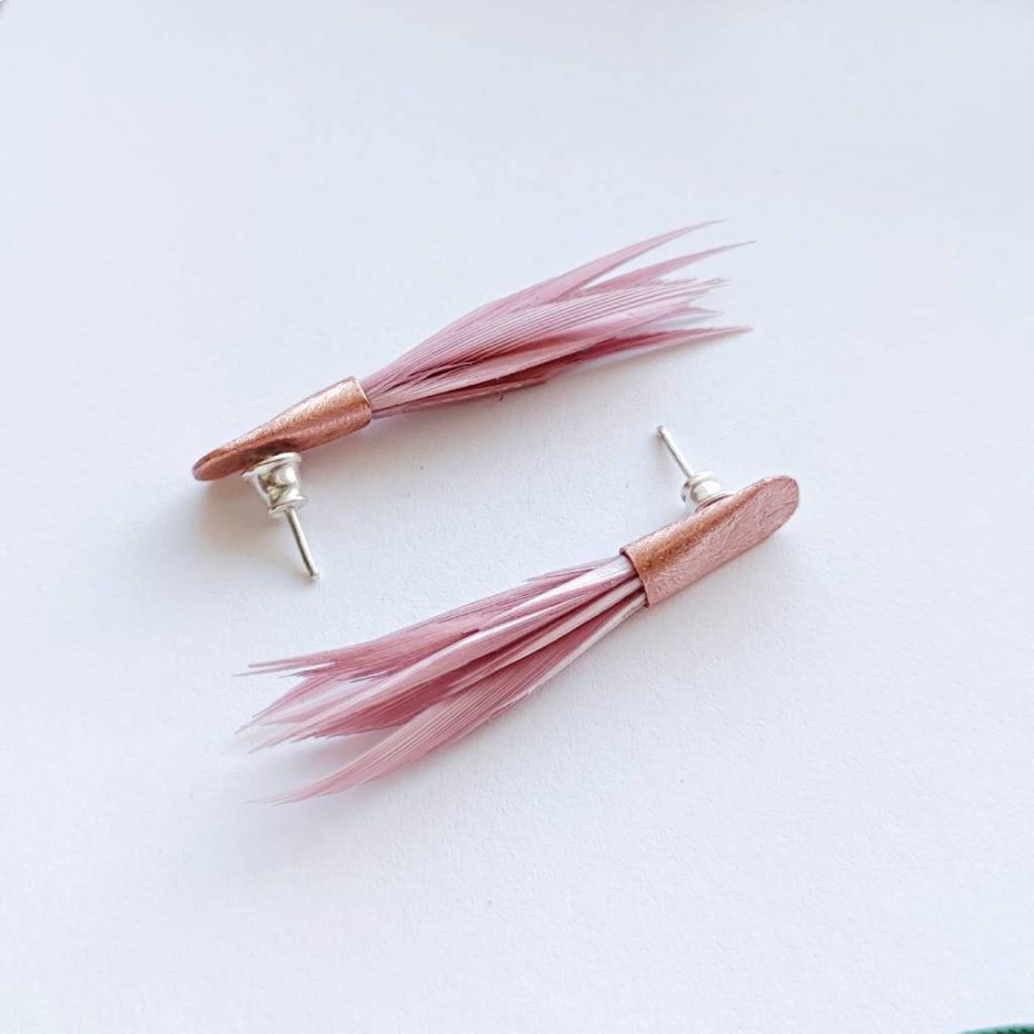 PIÓRKO - stylowy dodatek. Połączenie lekkości piórka i trwałości metalu. Metal niezwykle kontrastuje z naturalnym barwionym puchem. Kolczyki na sztyftach. Kolczyki wykonane są z :miedź, srebro- próby 0,925, naturalnie barwione pióra. Miedź - zmatowiony. Długość - ok. 4,5cm.